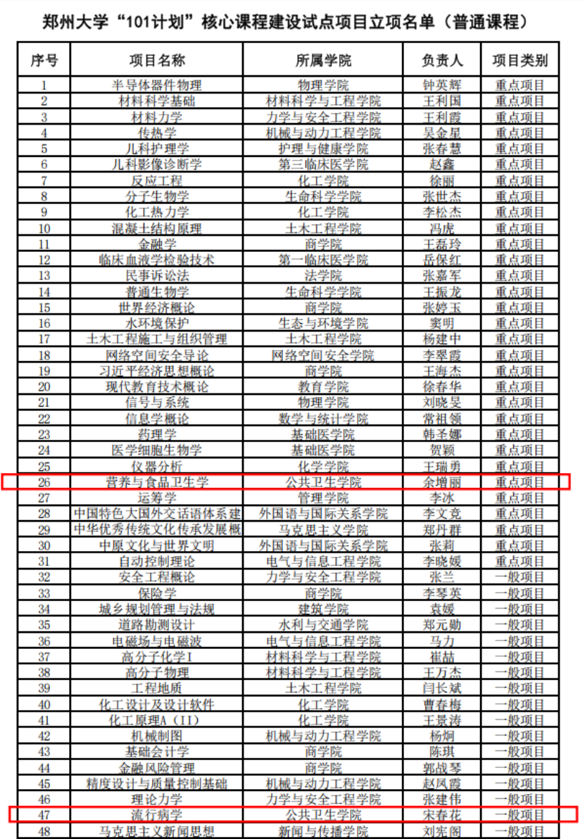 近日,郑州大学“101计划”核心课程建设试点项目立项名单正式公布,我院申报的3门核心课程成功获批立项,其中《营养与食品卫生学》入选重点试点课程,《流行病学》《卫生化学》入选一般试点课程。此次入选是学校对我院课程建设水平与人才培养质量的充分肯定,更是我院深化教育教学改革、推进学科内涵建设的重要突破,标志着我院核心课程建设进一步迈入规范化、高质量发展的新阶段。我院此次入选的3门试点课程,紧扣“101计划”...