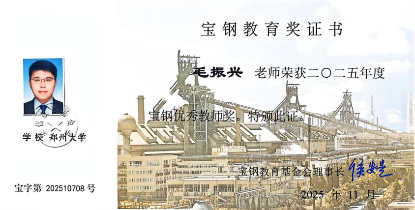 2025年11月15日,宝钢教育奖颁奖仪式在上海举行,郑州大学公共卫生学院毛振兴教授获“宝钢优秀教师奖”。宝钢教育奖是全国最具知名度的教育奖项之一。自1994年扩大设立以来,始终秉持“奖掖优秀人才,力行尊师重教,推动产学合作,支持教育发展”的宗旨,推动我国教育事业长足发展。